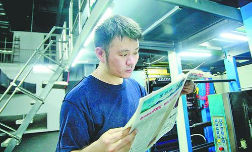 劉斌在查看剛剛印刷出來的報(bào)紙。記著 宋崇飛 攝