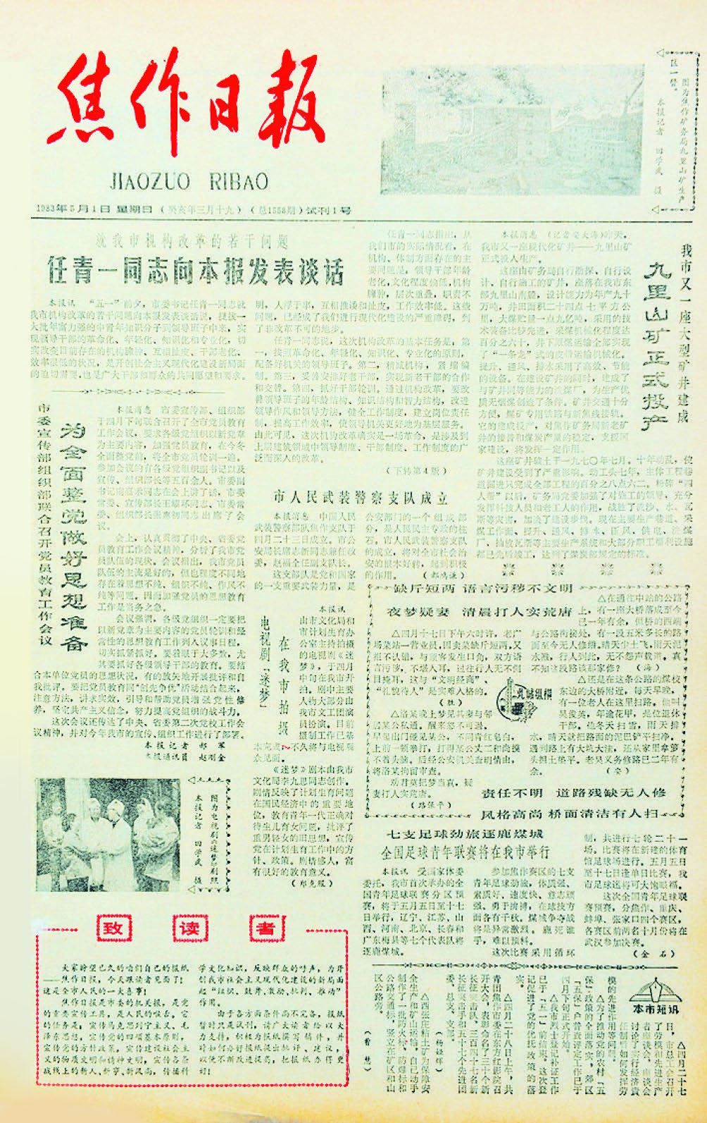 “《焦作日?qǐng)?bào)》是市委機(jī)關(guān)報(bào),是黨的重要宣傳工具,是人民的喉舌……由于各方面條件尚不完備,報(bào)紙暫時(shí)只是試刊,請(qǐng)廣大讀者給以大力支持,積極為報(bào)紙撰寫稿件,并對(duì)如何辦好報(bào)紙?zhí)岢雠u(píng)建議,以便不斷改進(jìn)提高,把報(bào)紙辦得更好!”樸素的試刊詞,表達(dá)了《焦作日?qǐng)?bào)》的辦報(bào)理念。