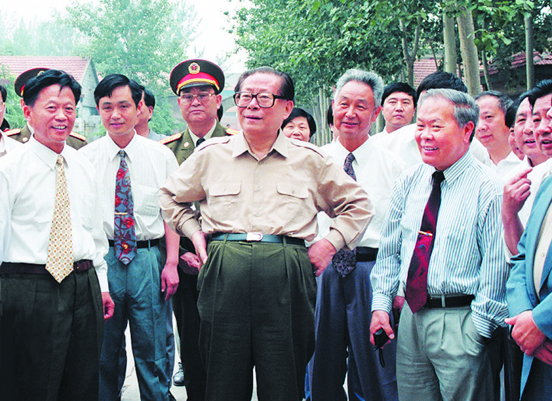 6月3日上午,江澤民的車(chē)直接停在了博愛(ài)農(nóng)場(chǎng)的大田頭。環(huán)視了一下四周,他似乎感到一切還是那么熟悉。他親切地問(wèn)博愛(ài)農(nóng)場(chǎng)場(chǎng)長(zhǎng)宋守業(yè),農(nóng)場(chǎng)還是那么多地嗎?畝產(chǎn)能達(dá)到多少?宋守業(yè)回答,地還是1977年時(shí)的那么多地,今年是個(gè)豐收年,畝產(chǎn)可望超500公斤,另外博愛(ài)農(nóng)場(chǎng)1995年已被農(nóng)業(yè)部確定為國(guó)家種子基地。在路上,江澤民看到了收割機(jī),禁不住發(fā)出感嘆:“這兒的收割機(jī)比原來(lái)的大也比原來(lái)的多,我在時(shí)可沒(méi)有這么多收割機(jī)!笨吹搅诉^(guò)去“五七”干校時(shí)的辦公樓,他說(shuō),這是過(guò)去干校的樓?吹綐呛蟮钠椒,他說(shuō):“就是這些房子,有好幾排。那時(shí)我在這里擔(dān)任常務(wù)副校長(zhǎng),半天學(xué)習(xí)半天勞動(dòng)。”江澤民對(duì)19年前工作過(guò)的地方充滿(mǎn)了深情,在原來(lái)生活過(guò)的住室里,坐在曾經(jīng)坐過(guò)的折疊椅上照相留影,并親切會(huì)見(jiàn)了留在農(nóng)場(chǎng)的老同志。