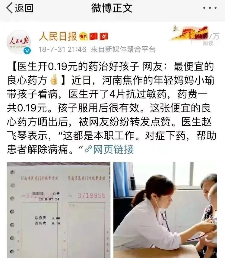 焦作市馬村區(qū)人民醫(yī)院趙飛琴開出“一毛九”藥方治好孩子丘疹的事跡,被人民日?qǐng)?bào)官方微博轉(zhuǎn)發(fā)。