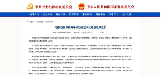 11月21日,中央紀(jì)委國家監(jiān)委網(wǎng)站發(fā)布沁陽市紀(jì)委監(jiān)委加強(qiáng)廉潔文化建設(shè)的做法。全文如下: