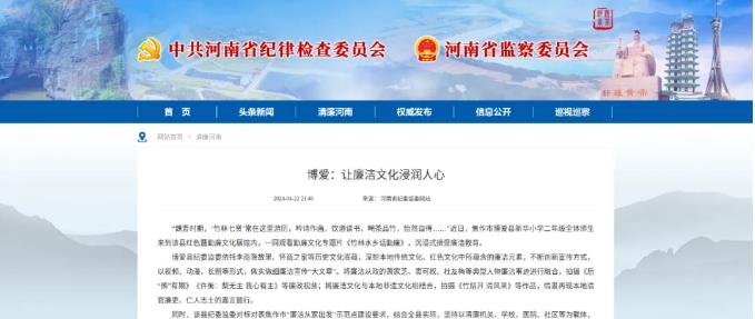 “魏晉時期,‘竹林七賢’常在這里游歷,吟詩作畫,飲酒讀書,喝茶品竹,怡然自得……”近日,焦作市博愛縣新華小學(xué)二年級全體師生來到該縣紅色暨勤廉文化展館內(nèi),一同觀看勤廉文化專題片《竹林水鄉(xiāng)話勤廉》,沉浸式接受廉潔教育。